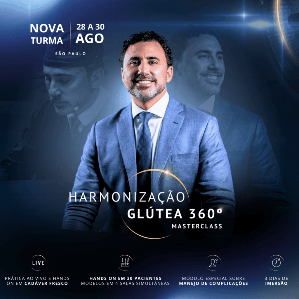 ONLINE – Masterclass de Harmonização Glútea com Dr Roberto Chacur, incluindo teoria com módulo especial sobre manejo de intercorrências, além de aula de anatomia teórica e prática em cadáver fresco e demonstração em paciente modelo. Com 20 anos de experiência, o Dr Chacur dedica-se exclusivamente à pesquisa e realização diária de preenchimento facial e corporal. Autor de dois livros e dezenas de artigos que levaram o aperfeiçoamento da técnica, o médico é speaker e referência internacional na técnica.